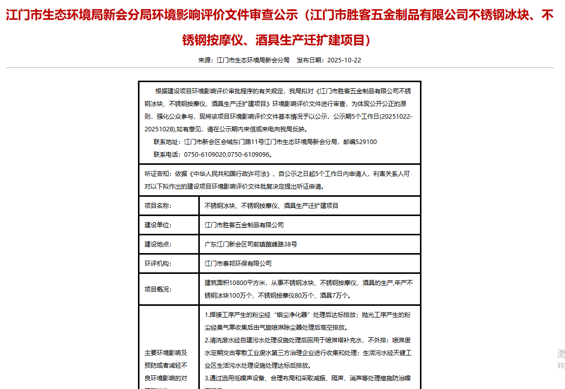2025年10月22日,江門市生態環境局新會分局就江門市勝客五金制品有限公司不銹鋼冰塊、不銹鋼按 摩儀、酒具生產遷擴建項目環境影響評價文件進行審查公示,公示期:5個工作日。(來源:江門市生態環境局新會分局)